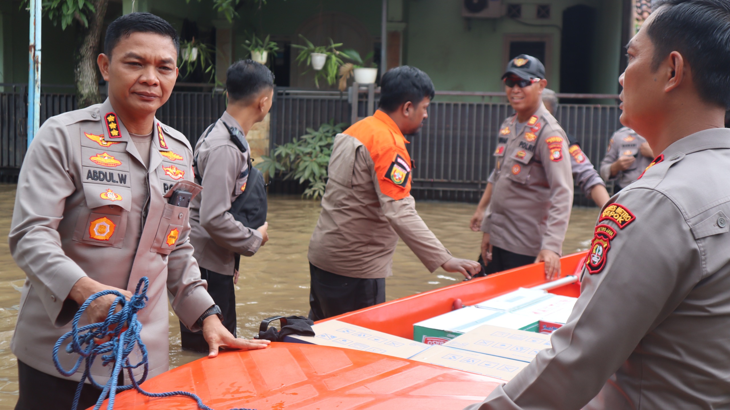 Selain melakukan evakuasi, petugas juga mendistribusikan bahan pangan kepada warga yang masih bertahan di rumah mereka. Kapolres Metro Depok Kombes Abdul Waras bersama jajaran dan unsur TNI meninjau langsung kondisi banjir di Kelurahan Sawangan Baru, Kecamatan Bojongsari.
