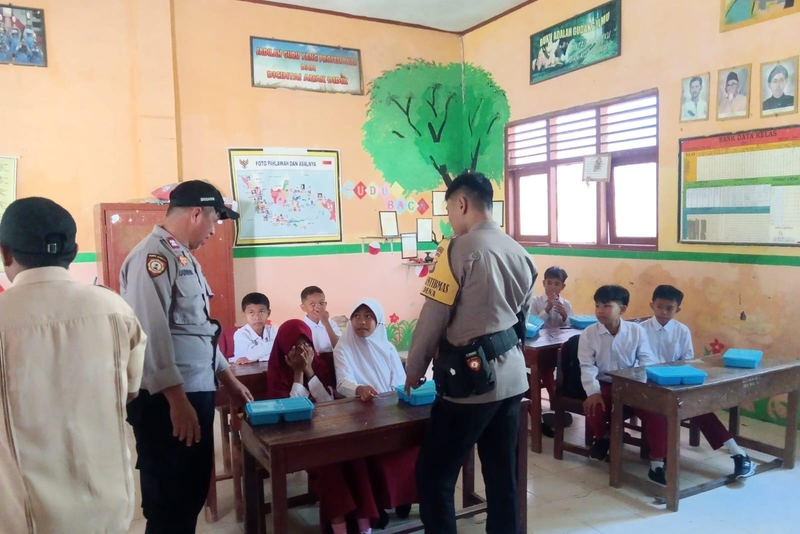 Personel Polsek Madapangga Polres Bima Polda NTB Mendampingi dan mengawal Program Makan Bergizi Gratis (MBG) di Wilayah Kecamatan Madapangga Senin, (21/4/25)