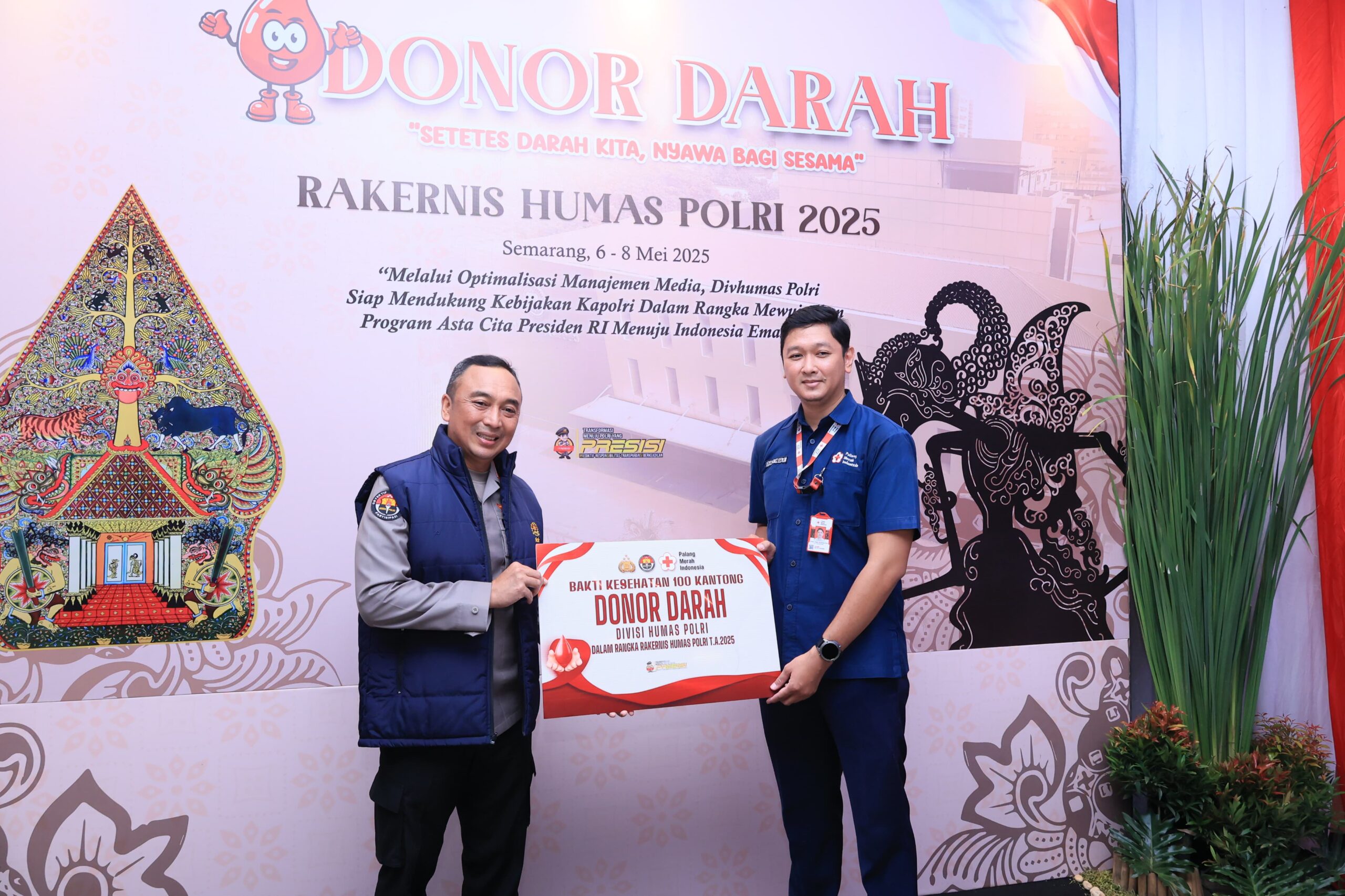 Tak hanya itu, digelar pula kegiatan bakti kesehatan berupa donor darah yang diikuti oleh 100 peserta, terdiri dari peserta Rakernis, panitia, dan personel Polda Jawa Tengah. Dalam kesempatan tersebut, Kadivhumas Polri Irjen Pol. Dr. Sandi Nugroho secara simbolis menyerahkan 100 kantong darah kepada PMI, disusul dengan penyerahan cinderamata oleh Irjen Pol. Anwar sebagai bentuk apresiasi terhadap kontribusi kemanusiaan.