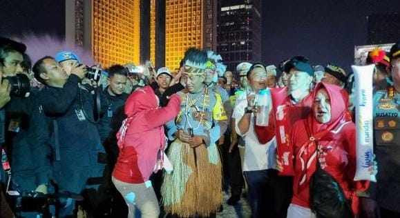 Kapolri menyapa masyarakat usai pertunjukan drone show dan pesta kembang api. Ia berjalan beriringan dengan Prasetyo Hadi mengitari kawasan Monumen Selamat Datang.